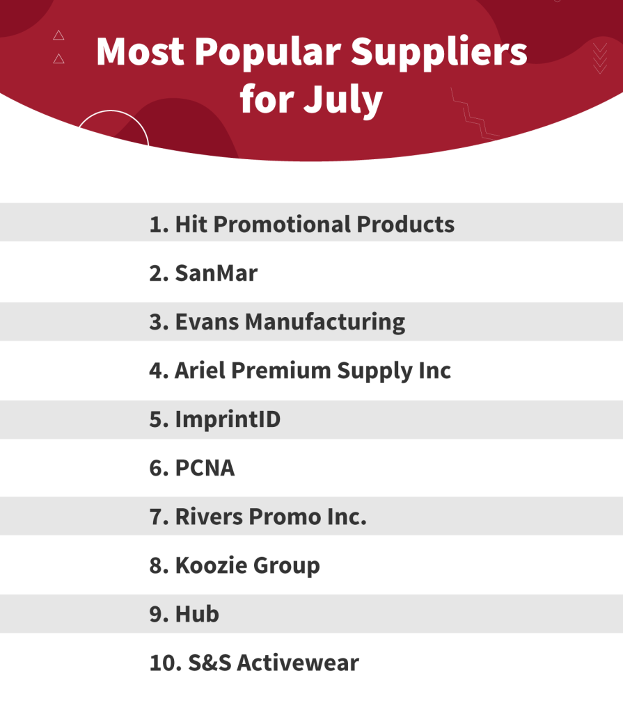 Hit Promotional Products claimed the top spot once again, with SanMar and Evans Manufacturing rounding out the top three. From apparel giants to promo powerhouses, July’s top suppliers reflect a strong mix of basics, best-sellers, and innovation. ImprintID and Ariel Premium Supply Inc. continue to climb the ranks, while S&S Activewear made its first appearance on the list.