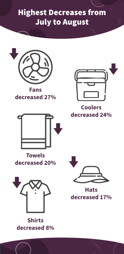 On the flip side, summer staples began to slide. Fans dropped by 27%, followed closely by coolers and towels. Hats and shirts also dipped, showing the natural shift as distributors transition away from peak summer promotions.