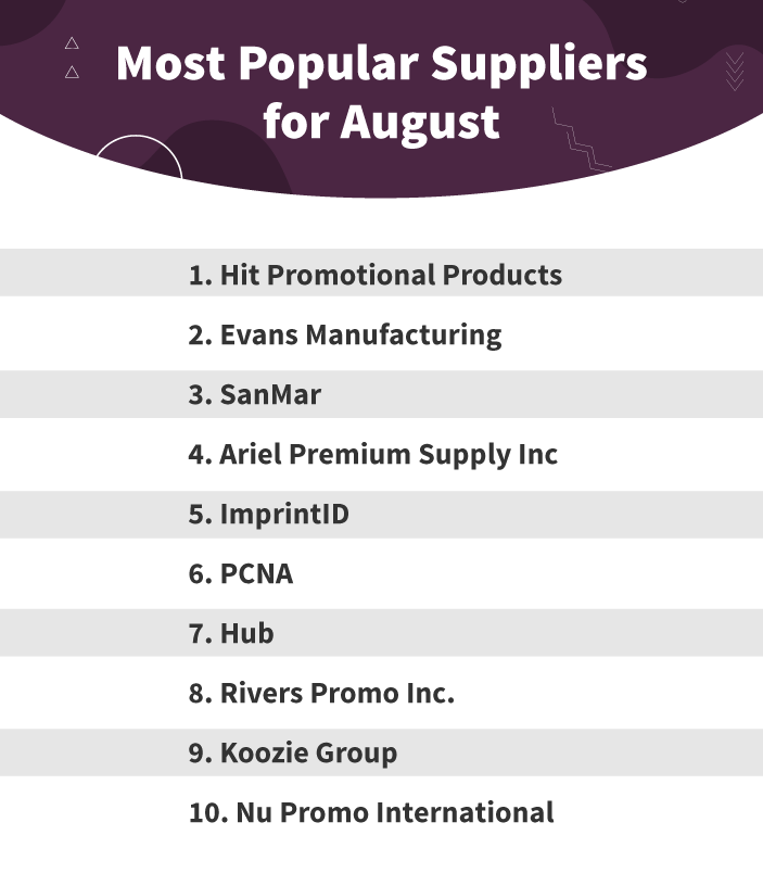 The rest of the list saw some changes, with PCNA, Hub, Rivers Promo Inc., Koozie Group, and Nu Promo International all making appearances in August’s top 10. These newcomers replaced July’s one-off entry, S&S Activewear, and show just how competitive the supplier rankings can be.