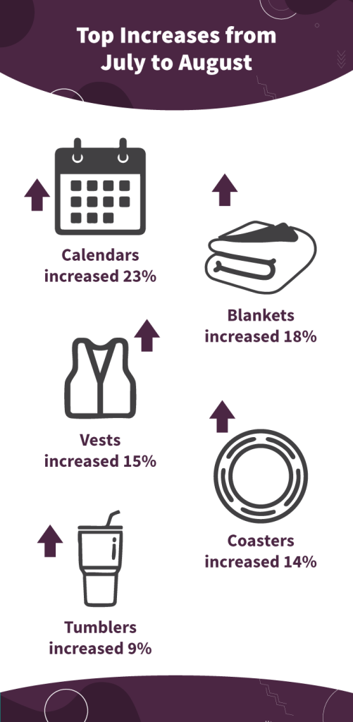 Along with the rankings, a few categories saw notable jumps this month. Calendars rose by 23%—a sure sign that fall planning is kicking into high gear. Blankets and vests also increased as distributors looked ahead to cooler weather, while coasters and tumblers rounded out the top gainers.
