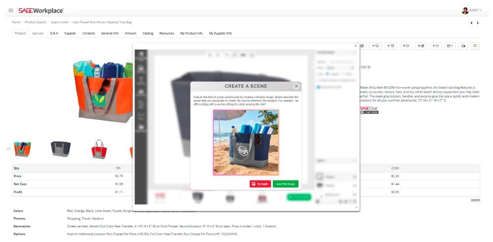 Not satisfied with a traditional mockup and wish you had more lifestyle images of products “out in the wild”? There’s no need for expensive photo shoots or hours spent looking for the just-right stock photo. In SAGE Design Studio, you can use the AI-powered image generator to create the lifestyle image of your dreams. All you need is a descriptive prompt to make your vision become a reality. Think of it as creating a scene to help your client visualize how their brand could appear in real life.
