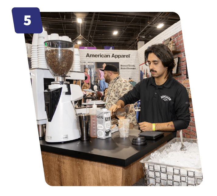 If the purpose of an exhibit booth is to draw attention in a crowded space, then Gildan’s strategy of free coffee was a bullseye. At an event known for long lines at the coffee shop, this apparel brand took things into their own hands to introduce Expo attendees to their attire. If you caffeinate them, they will come. Once you arrived, you could watch the live shirt pressing while your drink was being made.