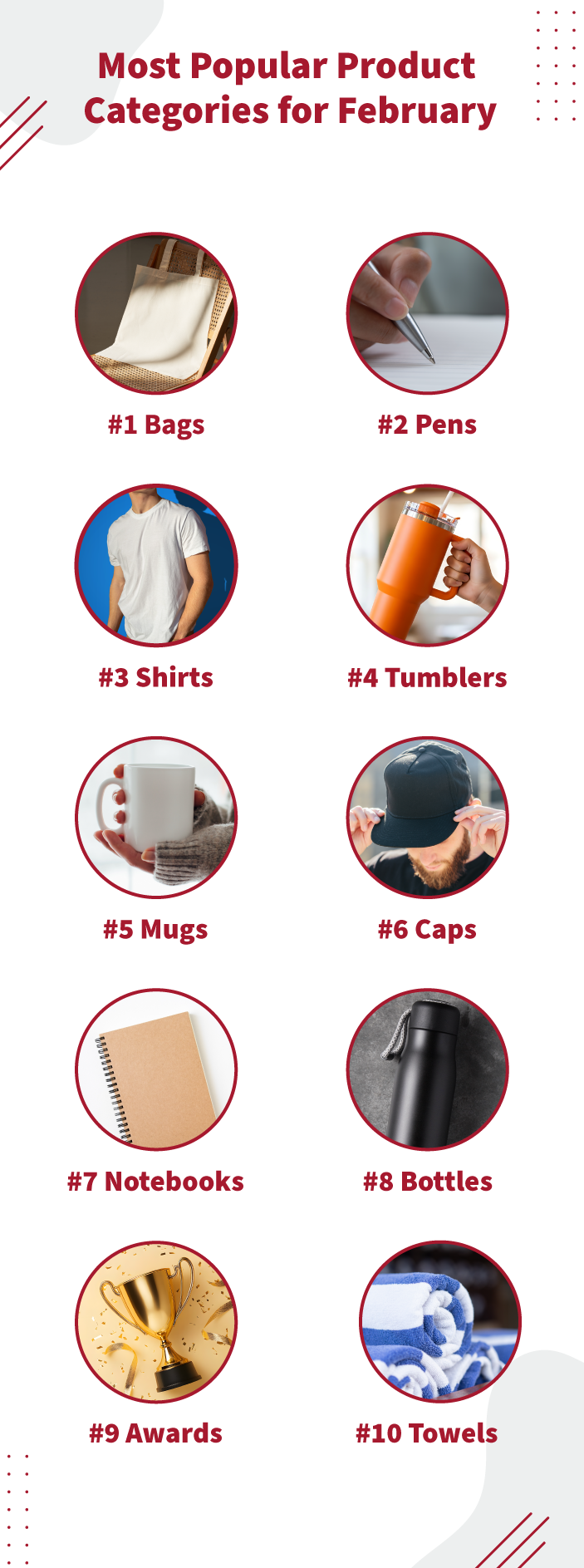 This month’s list features 25 products from 10 suppliers. Fifteen items held their spots from January, while the remaining positions welcomed fresh spring and summer arrivals. Category representation broadened slightly, though bags once again dominated (12), followed by drinkware (4), pens (3), coloring books (2), can coolers (2), and one journal and one lip balm.