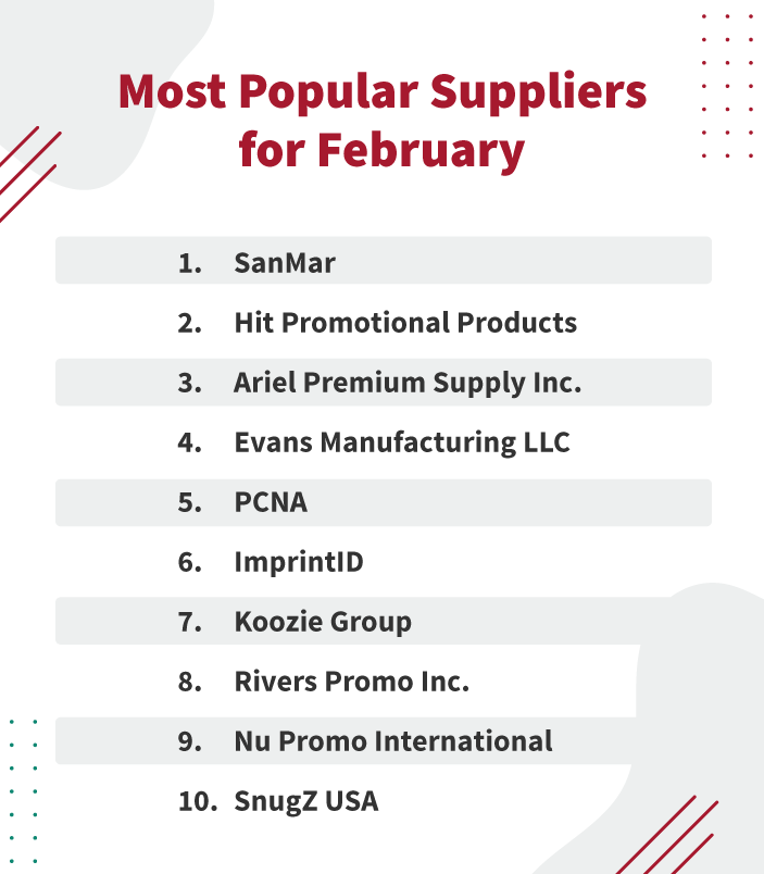 Here are the 10 most-viewed suppliers for February. SanMar maintains its stronghold at #1, a position it has held since September 2025. Evans Manufacturing and PCNA traded places, and Snugz USA broke into the rankings for the first time, bumping S&S Activewear from the list.
