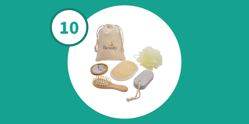 The Me-Time 5-Piece Spa Kit transforms any daily routine into a luxurious spa-like experience. The set includes a mesh scrubber for gentle exfoliation, a pumice stone to smooth rough areas, a bamboo-backed mirror, a wooden hairbrush that detangles while promoting scalp circulation, and a padded loofah sponge with an elastic strap for comfortable cleansing and a rich lather. All items are conveniently stored in a cotton drawstring bag for easy organization and travel. This elegant kit offers the perfect blend of function, style, and everyday indulgence.