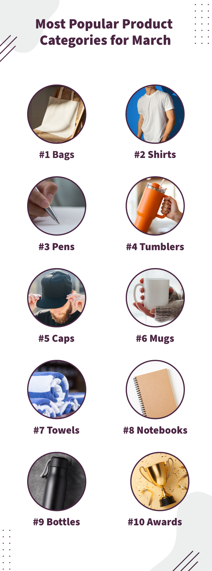 In March 2026, the top 10 product categories show a few notable shifts while the top six positions remain unchanged, with Bags, Shirts, Pens, Tumblers, Caps, and Mugs continuing to dominate. The most significant movement occurs in the lower half of the list: Towels make a strong jump from 10th in February to 7th in March, indicating increased demand. Notebooks slips slightly from 7th to 8th, while Bottles drops from 8th to 9th. Awards also decline one spot to 10th. Meanwhile, Chargers and Coats, which were present in January, are no longer in the March top 10, reinforcing a shift in demand toward categories like Towels. Overall, the changes suggest stable core demand with some reshuffling among secondary categories.