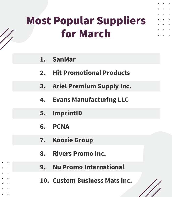 In March 2026, the top 10 supplier list remains largely stable, with most positions unchanged from February. SanMar, Hit, Ariel, Evans, Koozie, Rivers Promo, and Nu Promo all maintain their rankings, indicating consistent performance among the leading suppliers. However, there are a few notable shifts: imprintID moves up to 5th, overtaking PCNA, which drops to 6th. Additionally, SnugZ, previously ranked 10th, is replaced by Custom Business Mats, making Custom Business Mats the only new entrant to the top 10 in March. Overall, the changes suggest minor adjustments in supplier performance rather than significant disruptions.